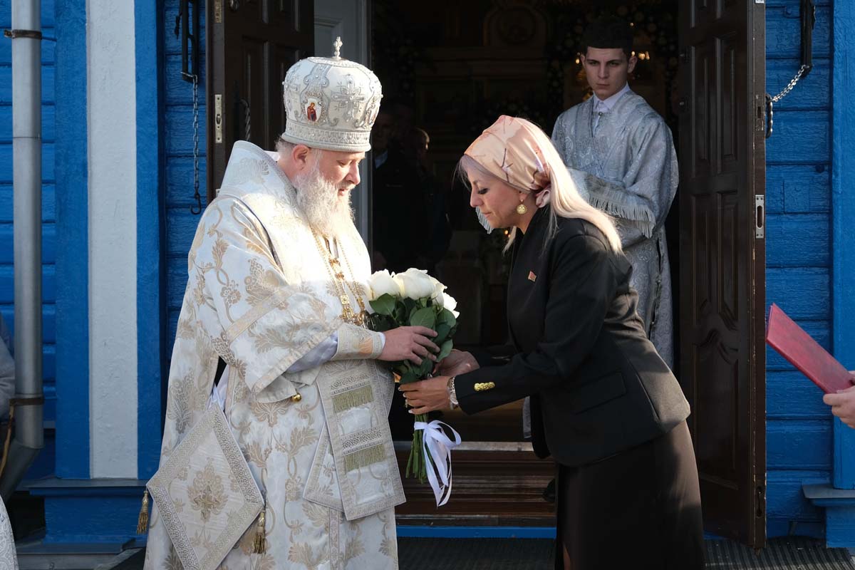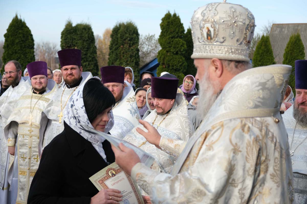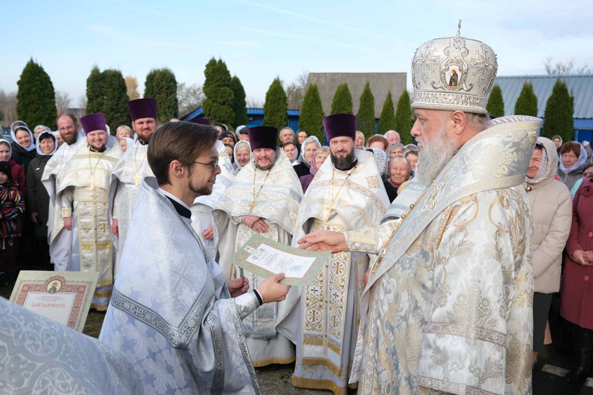 14 ноября Божественную литургию совершил Высокопреосвященнейший Иоанн, Архиепископ Брестский и Кобринский по случаю 140-летия со дня освящения храма. Управляющего Брестской епархией с хлебом и цветами встречали учащиеся воскресной школы прихода Шкутник Роман, Скочиковский Илья и Гац Мария, представители приходского молодежного братства в честь святителя Кирилла Туровского Кривец Дионисий и Панасюк Анастасия. Далее высокого гостя приветствовал секретарь Брестского епархиального управления, благочинный церквей Жабинковского округа, настоятель храма протоиерей Сергий Петрусевич. За Божественной литургией Архиепископу Иоанну сослужили: настоятель храма Покрова Пресвятой Богородицы в г. Жабинка протоиерей Сергий Петрусевич, благочинный церквей Малоритского округа, настоятель храма святителя Николая Чудотворца в г. Малорита протоиерей Виктор Полетило, настоятель храма святого великомученика Дмитрия Солунского в д. Рогозно протоиерей Владимир Алексеев, настоятель храма святого равноапостольного князя Владимира в аг. Муховец Брестского района протоиерей Димитрий Иванов, настоятель гарнизонного храма святителя Николая Чудотворца в Брестской крепости протоиерей Виталий Хоновец, настоятель храма преподобной Параскевы Сербской д. Збироги Брестского района священник Николай Хивук, настоятель храма Покрова Пресвятой Богородицы в д. Орепичи священник Василий Ищенко, настоятель храма святого Архистратига Михаила в аг. Остромечево Брестского района священник Владимир Свидунович, настоятель храма Тихвинской иконы Божией Матери в г. Бресте священника Андрей Петрусевич, настоятель храма Успения Пресвятой Богородицы в д. Бульково священник Петр Дударчук, настоятель храма святого равноапостольного князя Владимира в д. Чижевщина священник Александр Сытин, настоятель храма Вознесения Господня д. Огородники священник Владимир Кондращук, клирик храма Покрова Пресвятой Богородицы в г. Жабинка священник Максим Волк, настоятель храма святого Архангела Михаила в аг. Степанки священник Георгий Залевский, настоятель храма святого великомученика Никиты в г. Жабинка священник Михаил Колодяжный, клирик храма святителя Кирилла Туровского в г. Жабинка священник Иаков Андросюк, клирик кафедрального собора в г. Бресте диакон Иоанн Шкулепа. Богослужебные песнопения исполнил хор храма святителя Кирилла Туровского в г. Жабинка под управлением Петрусевич Е.В. По окончании богослужения был совершен молебен и крестный ход вокруг храма. Архиепископ Иоанн обратился к молящимся со словом назидания, поздравил духовенство и прихожан храма с юбилейной датой в истории храма - 140-летием со дня освящения и вручил епархиальные награды активным прихожанам. Клирику храма священнику Максиму Волку была вручена Юбилейная грамота в связи с 1030-летием Православия в Беларуси. Педагогу воскресной школы прихода Полещук И.И. была вручена Благодарность Синодального отдела Белорусской Православной Церкви по катехизации за усердные труды на ниве духовного просвещения. Далее заместителем председателя Жабинковского районного исполнительного комитета Тарасевич И.В. был зачитан приветственный адрес и переданы слова поздравления от председателя Жабинковского районного исполнительного комитета Кузьмича А.Н. по случаю празднуемого юбилея. Архиеписк
