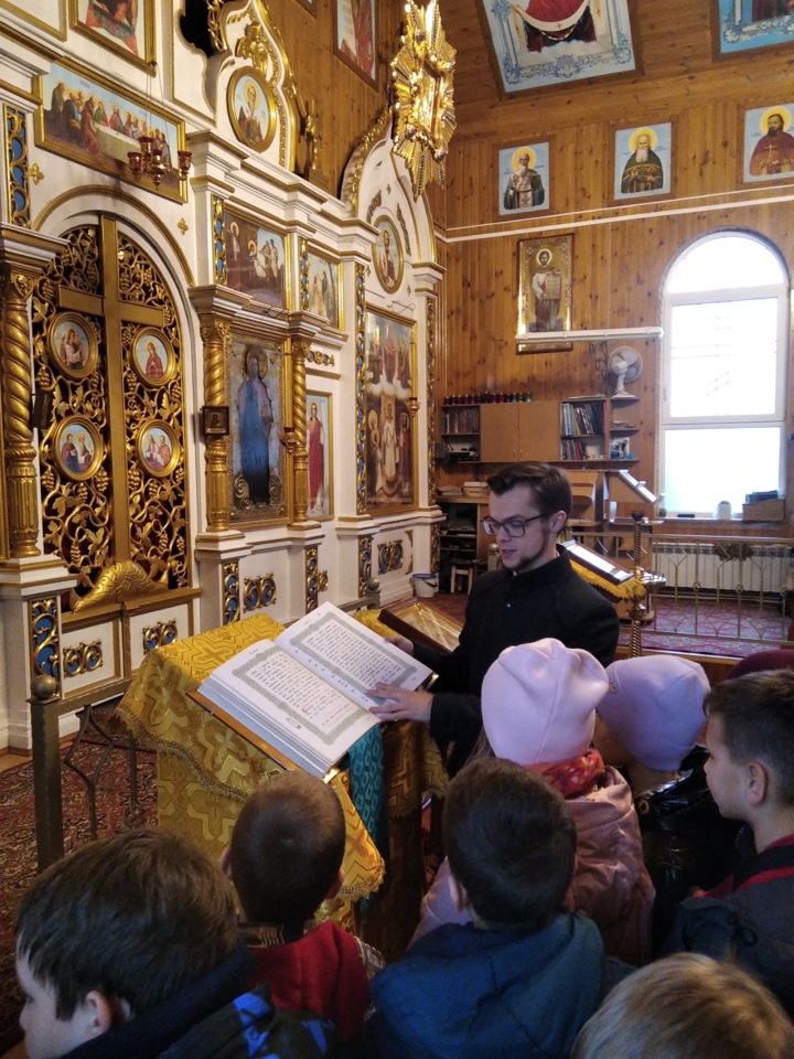 Клирик храма Покрова Пресвятой Богородицы в г. Жабинка священник Максим Волк провел для ребят экскурсию по территории храма, где ребята смогли познакомиться с убранством храма, богослужебной утварью и основами христианского вероучения. Священнослужитель рассказал о правилах поведения в церкви, познакомил с православным представлением о Боге как Творце мира. Далее дети узнали о Пасхе как самом главном празднике Православной Церкви и ее значимости для верующих. В завершение встречи отец Максим познакомил ребят с богослужебным напрестольным Евангелием и Евхаристической Чашей, их символикой и техникой изготовления в прежние времена.