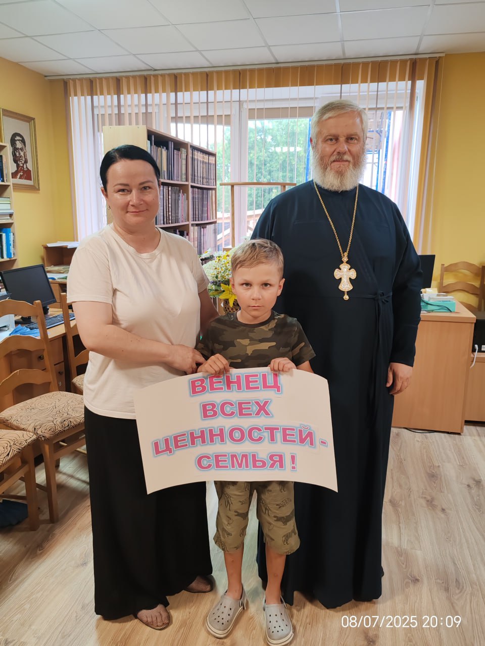 08 июля 2025 года в Жабинковской центральной районной библиотеке ГУК «Жабинковская районная централизованная библиотечная система» состоялась встреча слушателей воскресной школы для взрослых «Духовный родник» и их семей, посвященная памяти святых благоверных Петра и Февронии, Муромских чудотворцев. Для участников встречи была организована познавательно-игровая программа «Венец всех ценностей - семья», а также викторина «Семья - малая Церковь». Далее состоялась беседа с благочинным церквей Жабинковского округа протоиереем Сергием Петрусевичем и матушкой Еленой на тему: «Православные традиции и духовные ценности семьи». В ходе импровизированного диалога было обращено внимание на важность сохранения православных традиций в семье и передачи их новым поколениям с самого младшего детского возраста. Особое внимание было уделено служению семьи священнослужителя в современном мире. В завершении встречи за чаепитием слушатели поделились воспоминаниями о том, как православная вера, книги Священного Писания сохранялись в семьях их родных во времена гонений на Церковь Христову, как духовная мудрость их рода привела к вере в Иисуса Христа.