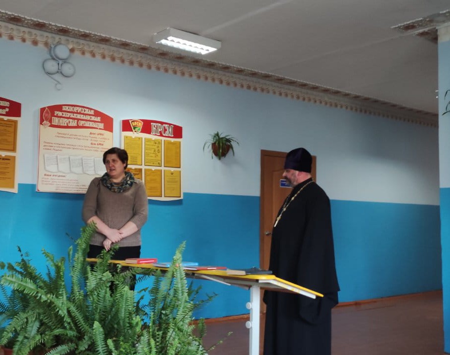 Затем священник Вадим передал в дар школьной библиотеке несколько книг духовного содержания, поблагодарил директора школы Зинкевич Е.В. и учителей за сотрудничество.