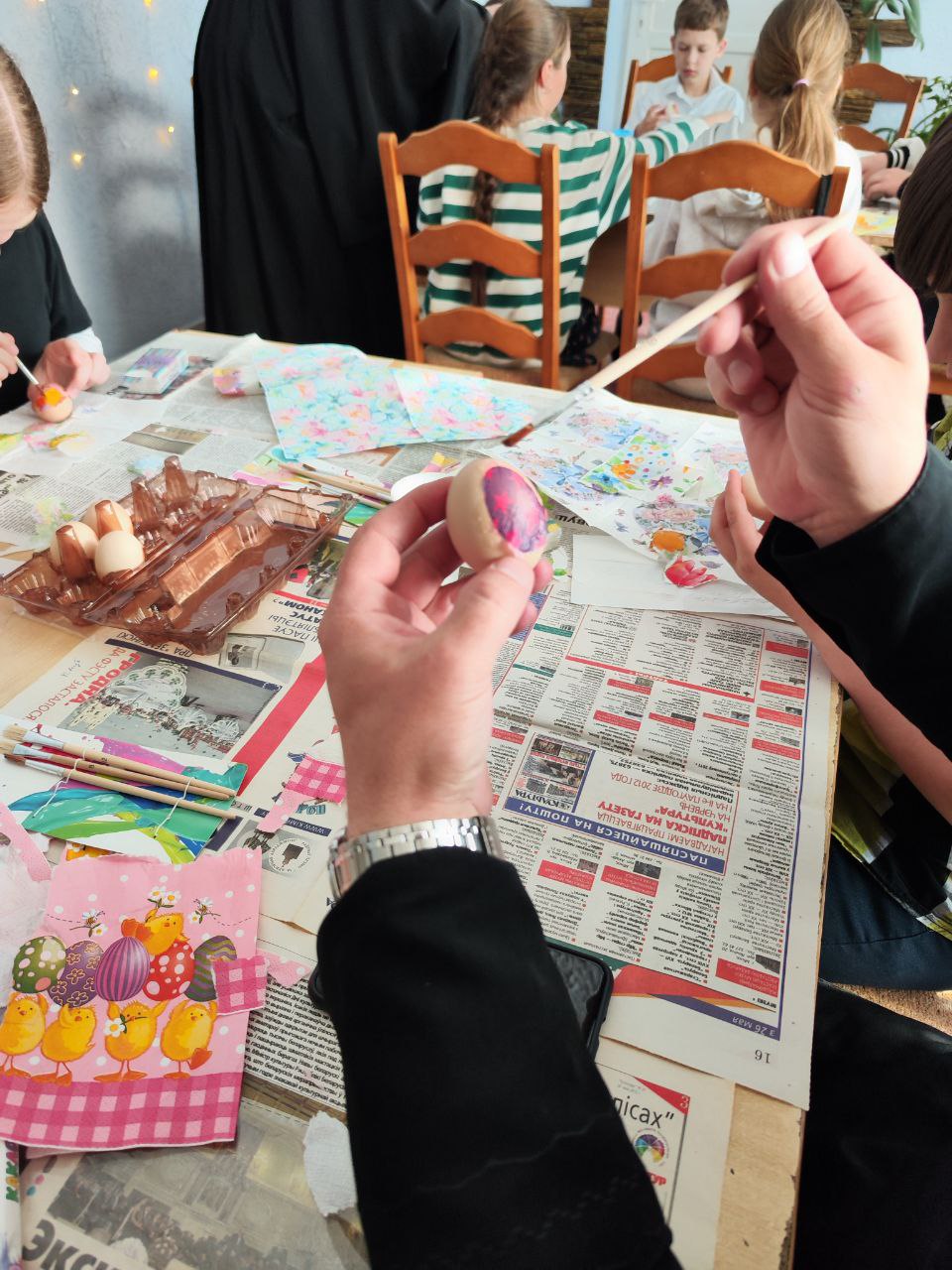 25 апреля 2024 года в Хмелевском сельском Доме культуры ГУК «Жабинковская централизованная районная клубная система» состоялся V-й мастер-класс по декупажу пасхальных яиц для учащихся воскресных школ Жабинковского благочиния, организованный воскресной школой мужского монастыря Преображения Господня в аг. Хмелево. В мероприятии приняли участие 40 воспитанников воскресных школ приходов благочиния: храма Покрова Пресвятой Богородицы в г. Жабинка с настоятелем храма, благочинным церквей Жабинковского округа протоиереем Сергием Петрусевичем и директором воскресной школы Быковой О.Г., храма святого великомученика Никиты в г. Жабинка с настоятелем храма священником Михаилом Колодяжным и директором воскресной школы Колодяжной М.С., храма Успения Пресвятой Богородицы в д. Бульково, храма святителя Николая Чудотворца в аг. Озяты, храма святого Архангела Михаила в аг. Степанки с настоятелем храма священником Георгием Залевским, храма святого равноапостольного князя Владимира в д. Чижевщина с настоятелем храма священником Александром Сытиным, мужского монастыря Преображения Господня в аг. Хмелево.