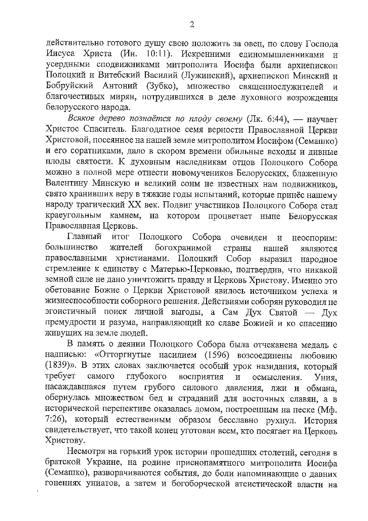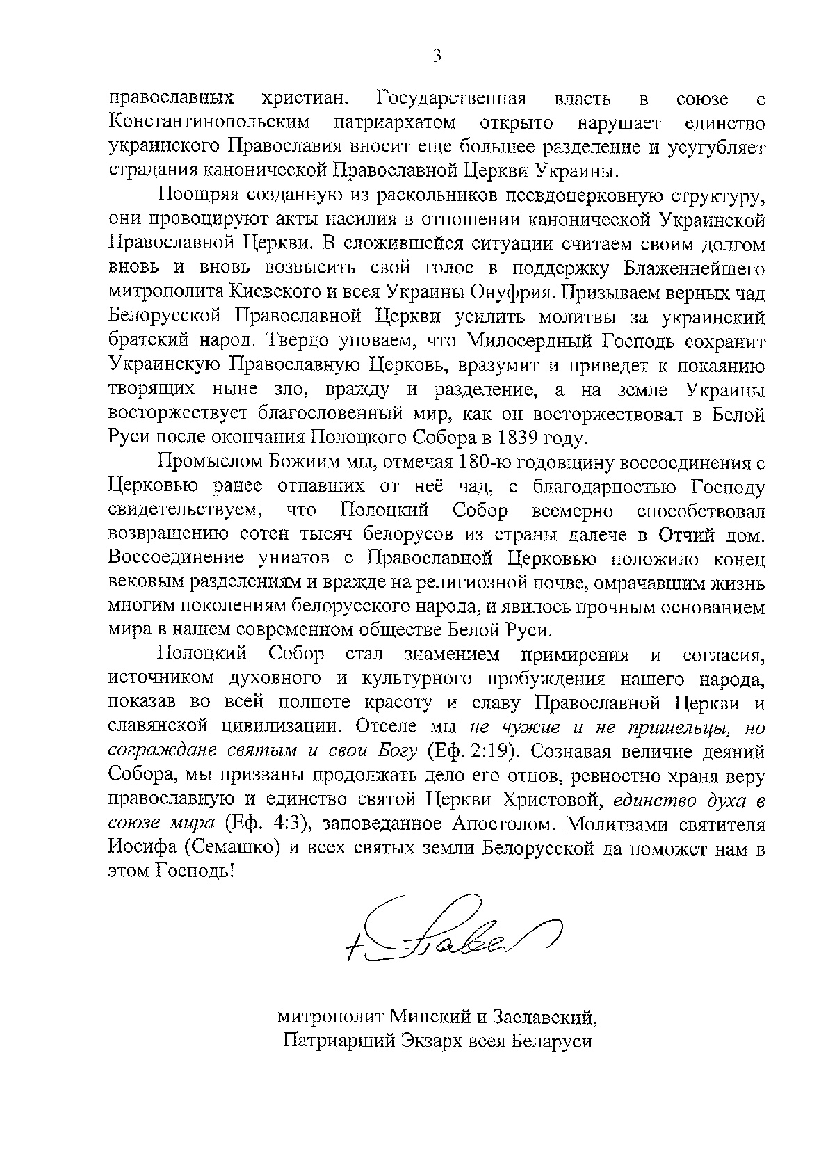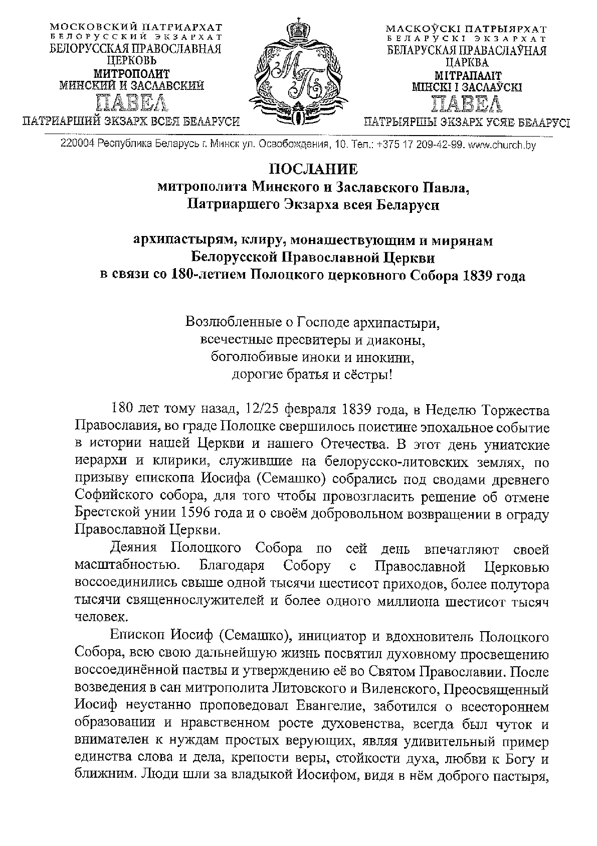 Послание митрополита Минского и Заславского Павла, Патриаршего Экзарха всея Беларуси в связи с 180-летием Полоцкого церковного Собора 1839 года