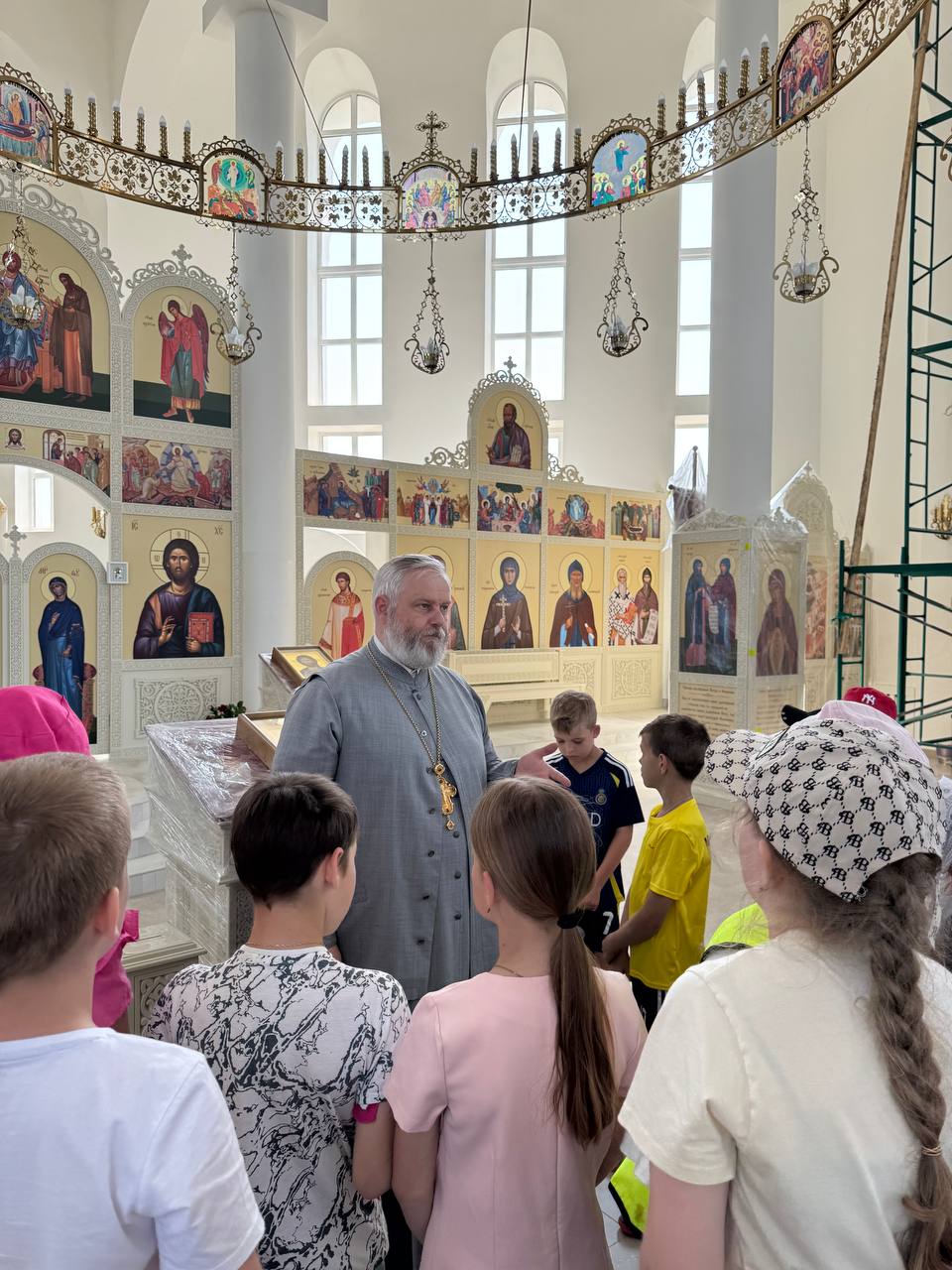 16 июня 2025 года воспитанники групп «Лунатики», «Лего» и «Королевство» воспитательно-оздоровительного лагеря «Радуга» на базе ГУО «Средняя школа №1 г. Жабинки имени И. Н. Зубачёва» в количестве 43 человек с педагогами Каштелян Т.В., Изотовой А.С., Сида Е.Н. посетили храм святителя Кирилла Туровского в г. Жабинка. Благочинный церквей Жабинковского округа протоиерей Сергий Петрусевич познакомил посетителей с символикой православных храмов, значением храма в жизни отдельного человека и общества в целом, а также провел экскурсию и уделил особое внимание священным изображениям. Учащиеся воспользовались возможностью прочитать вслух молитву «Отче наш». В завершение встречи священнослужитель ответил на вопросы, а также пожелал учащимся и педагогам успешно завершить работу летнего лагеря и с пользой провести время летнего отдыха с родными и близкими людьми.