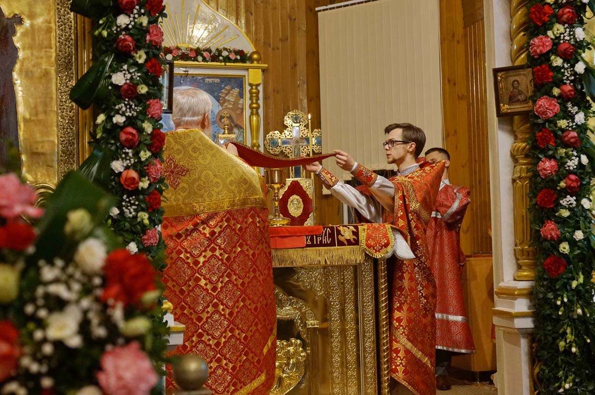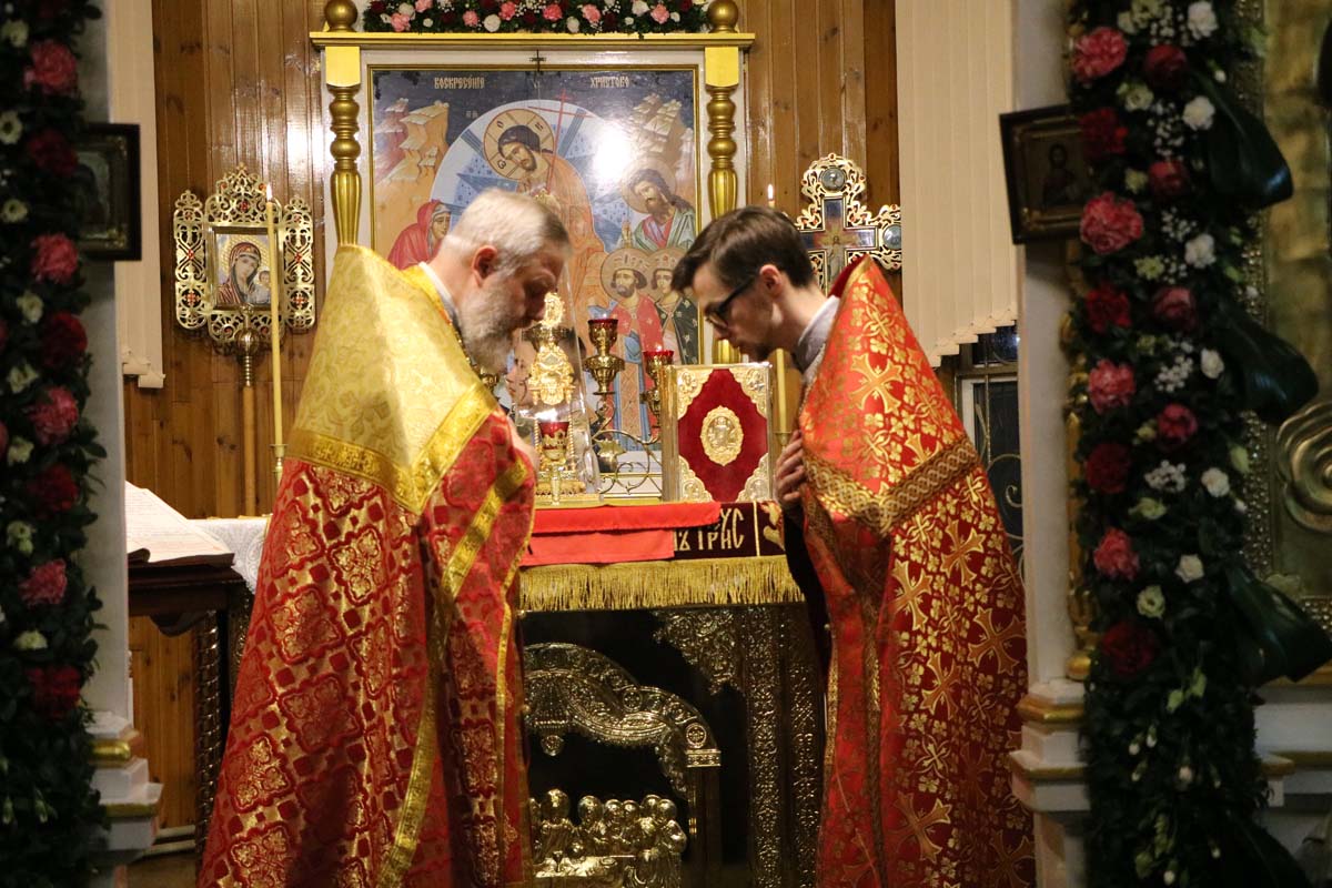 За Пасхальной заутреней настоятель храма прочитал Слово огласительное святителя Иоанна Златоуста на Святую Пасху, а на Литургии после Евангелия огласил Пасхальное послание Святейшего Патриарха Московского и всея Руси Кирилла архипастырям, пастырям, монашествующим и всем верным чадам Русской Православной Церкви.