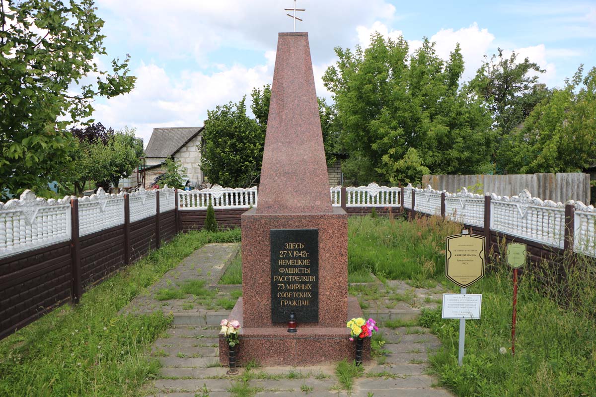 Осень 1942 года. К этому времени на территории Брестского, Жабинковского, Кобринского и Малоритского районов уже сформировались антифашистские подпольные организации и партизанские отряды, которые приступили к активным боевым действиям. Немцы использовали факты народного сопротивления для расправы над мирным населением. Особенно неслыханным репрессиям подверглись жители Жабинковщины во время карательной операции под кодовым названием «Треугольник». Всего, с 11 сентября по 29 октября 1942 года, каратели сожгли и расстреляли, на Жабинковщине, 900 ни в чём неповинных людей. Одна из трагедий разыгралась в деревне Стеброво (совр. Жабинка) . Из рассказа очевидца трагедии, Семенюк Семёна Николаевича, проживавшего в деревне Стеброво: «27 октября 1942 года, по приказу гестапо, все граждане, прибывшие из восточных областей, должны были явиться на регистрацию в деревню Стеброво. Под угрозой оружия было согнано более 70 мирных граждан. Из этого числа, гестаповцы, выделили 8 человек и заставили рыть ямы. После чего, всех согнанных, повели на расстрел, к яме. Не доходя 50 метров, гитлеровцы, приказали всем раздеться. Женщины и дети плакали, кричали и просили о помощи, но немецкие изверги были к этому глухи. Из числа 76 человек лишь четверым удалось избежать смерти. Это Михайлов Михаил Сергеевич и гражданка Ильина, с 2 детьми, проживающая в деревне Саки…» Сегодня о страшной трагедии в деревне Стеброво напоминает братская могила жертв фашизма в память о 73 расстрелянных мирных жителях. После освобождения Жабинковщины от немецко-фашистских захватчиков, в июле 1944 года, местные жители поставили на могиле большой деревянный крест. В 1967 г. появился обелиск, который обрел современный вид в 2009 году.