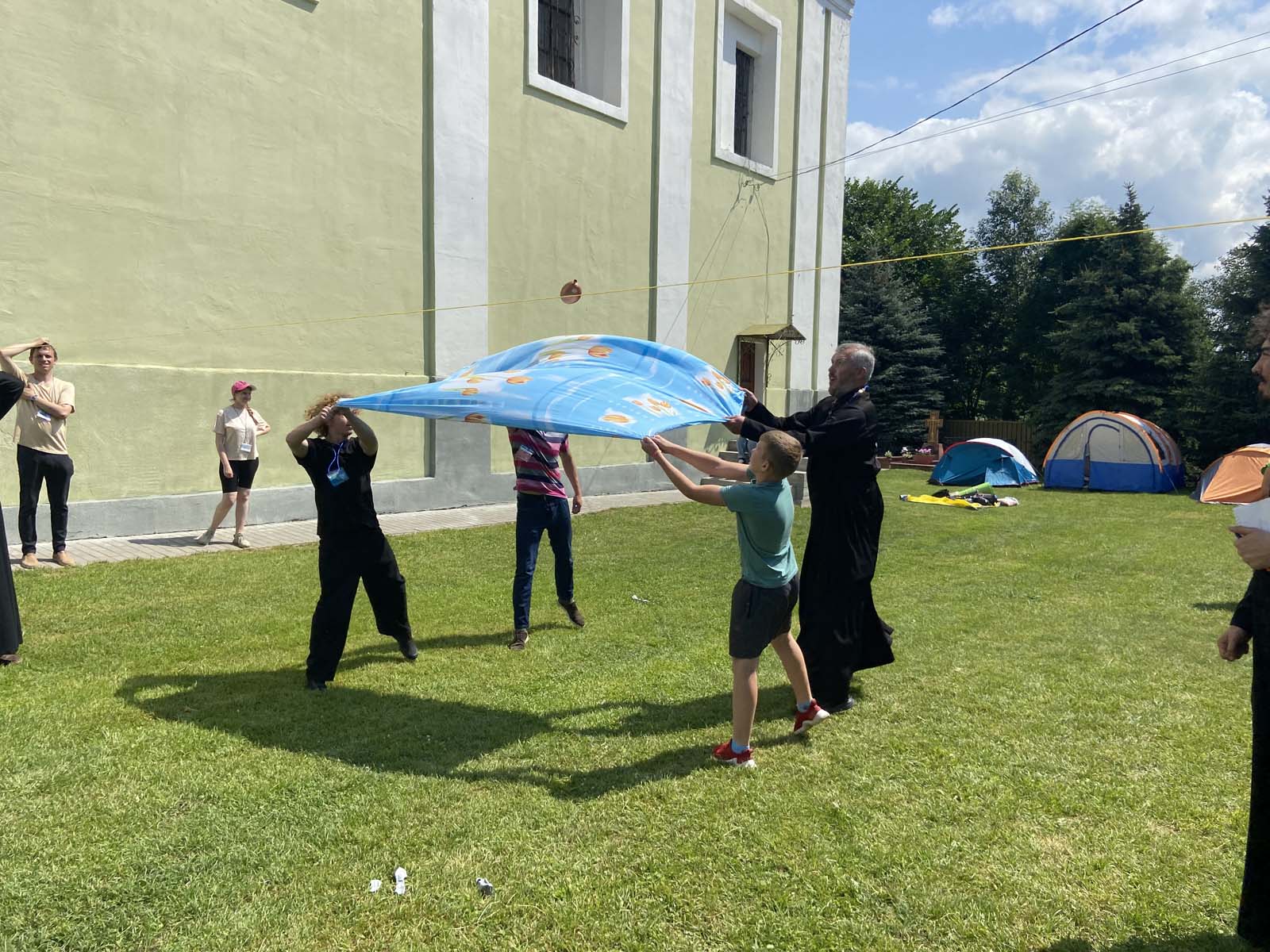 Далее участникам слета был предложен обед, по окончании которого состоялось спортивное состязание, в котором команды из числа молодежи и духовенства проверили свои физические навыки.