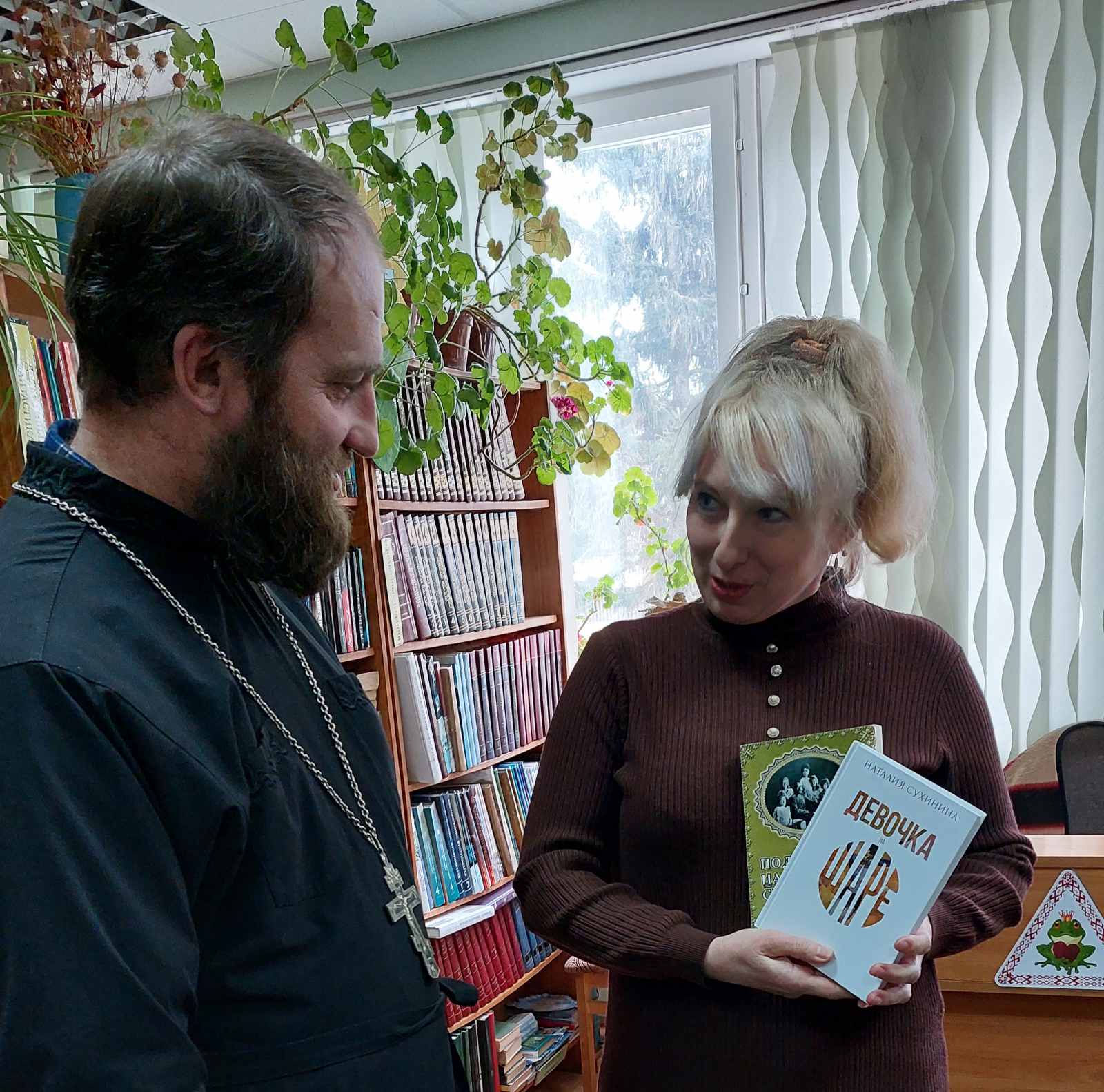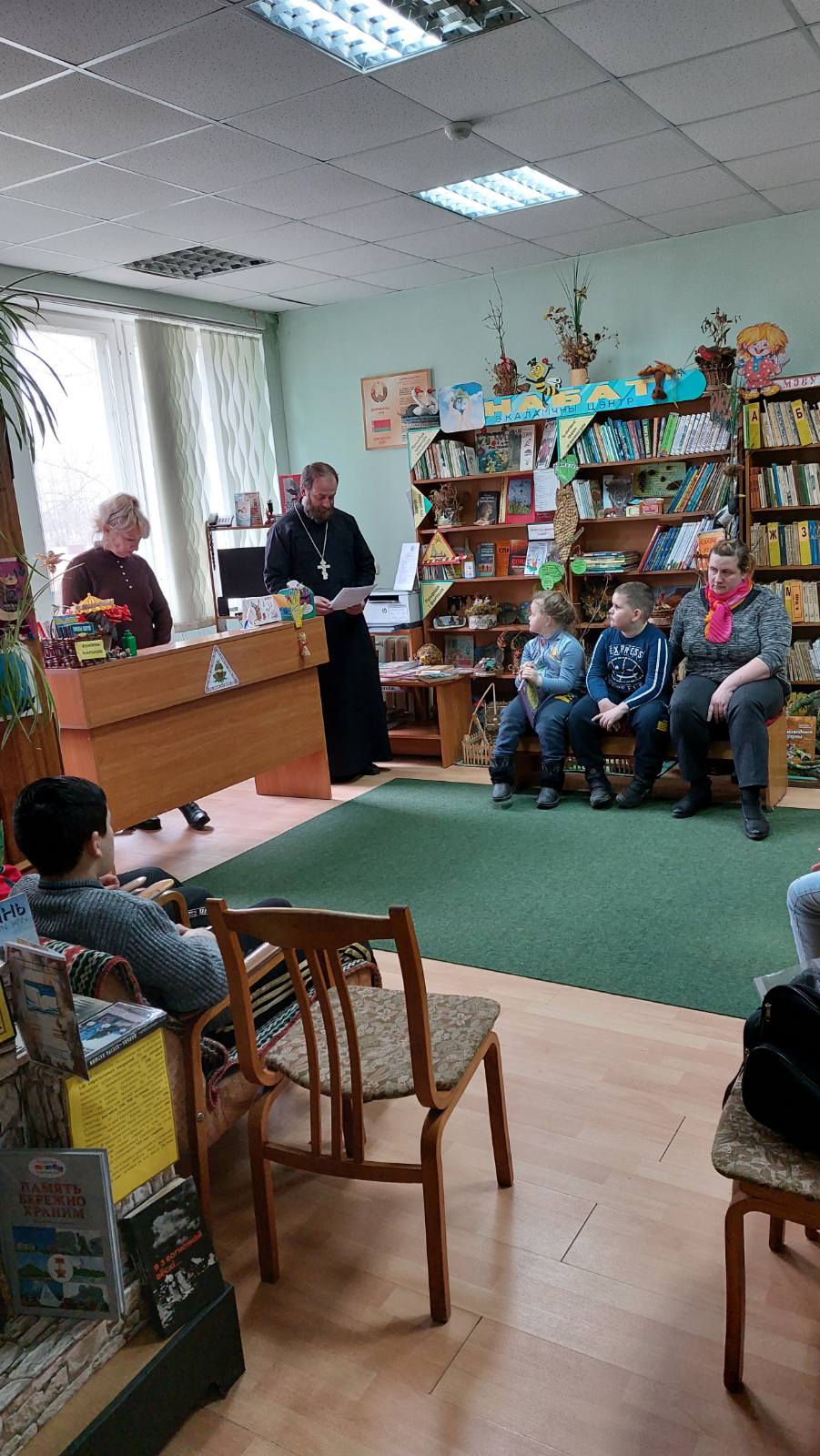 Далее отец Георгий рассказал о важности церковной литературы в жизни христианина и передал в дар библиотеке несколько книг духовного содержания: «Подвиг царской семьи» и «Девочка на шаре».