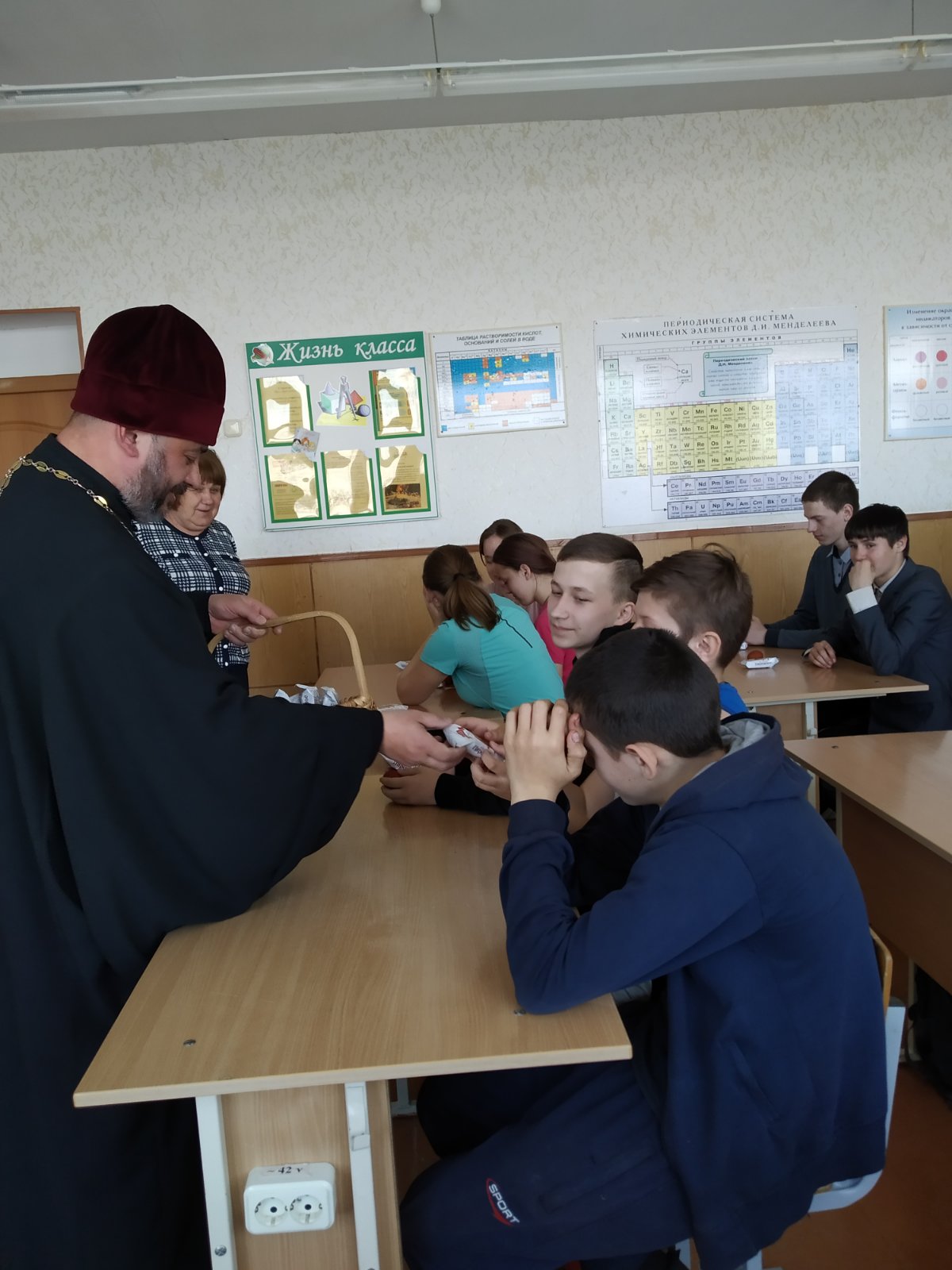Священнослужитель поздравил учащихся с Пасхой Христовой, рассказал о православных праздниках и их месте в жизни православного христианина. Особое внимание было уделено Пасхе — «Торжеству из торжеств» — традициям празднования и ее ролью в жизни человека. В завершение беседы священнослужитель вручил присутствовавшим сладкие подарки.