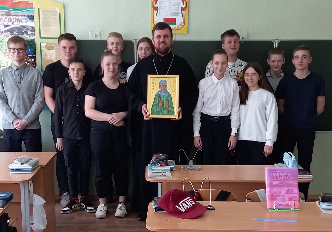 Священнослужитель рассказал историю возникновения православной веры на территории современной Беларуси, образование первой епархии и отдельной епархии на Брестской земле. Далее отец Петр познакомил учеников с сонмом белорусских святых. Особое внимание было уделено блаженной Валентине Минской, в честь которой строится храм в аг. Ракитница. В завершение беседы учащиеся смогли задать священнослужителю интересующие их вопросы.