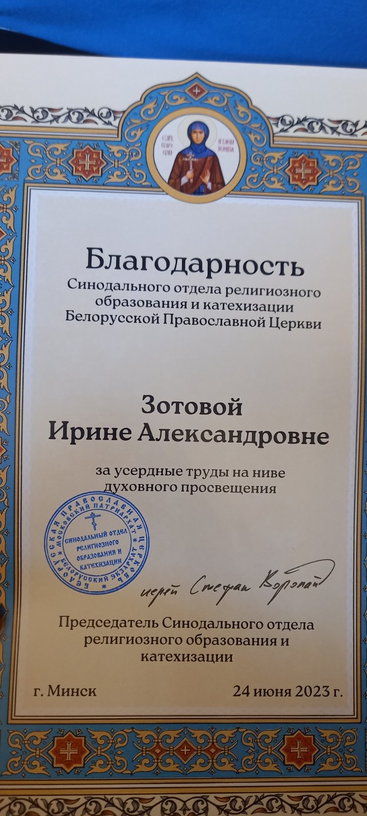 24 июня 2023 года педагог воскресной школы храма Покрова Пресвятой Богородицы в г. Жабинка Зотова И.А. приняла участие в работе Республиканского семинара-совещания педагогов воскресных школ Белорусского Экзархата в г. Минске, организованного Синодальным отделом религиозного образования и катехизации (СинОРОиК) Белорусской Православной Церкви. Перед началом работы форума состоялось знакомство с работами участников Республиканского конкурса детского творчества «Красота Божьего мира», интерактивной экспозицией работ участников конкурсов Синодального отдела религиозного образования и катехизации Белорусской Православной Церкви «Летний марафон воскресных школ» и digital-рисунков «Пасхальная весть», а также Республиканского интернет-конкурса методических разработок в области религиозного просвещения и духовно-нравственного воспитания «Кладезь мудрости». В работе семинара приняли участие Патриарший Экзарх всея Беларуси Митрополит Минский и Заславский Вениамин и председатель Синодального отдела религиозного образования и катехизации Русской Православной Церкви Митрополит Екатеринбургский и Верхотурский Евгений. В рамках мероприятия была организована работа тематических секций «Театральная деятельность в воскресной школе», «Единый учебно-методический комплекс для воскресных школ», «Квесты и интерактивные игры в воскресной школе». Торжественным итогом мероприятия стало награждение педагогов потрудившихся на ниве духовного просвещения. Зотовой И.А. была вручена Благодарность Синодального отдела религиозного образования и катехизации Белорусской Православной Церкви.