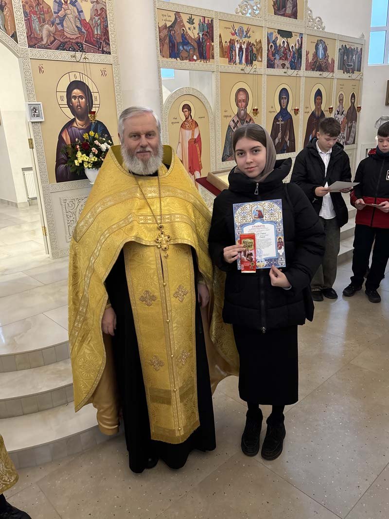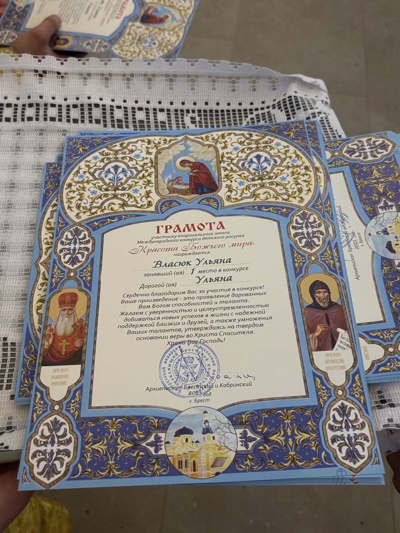Священнослужитель зачитал текст Грамоты, в котором говорится: «Сердечно благодарим Вас за участие в конкурсе! Ваше произведение- это проявление дарованных Вам Богом способностей и таланта. Желаем с уверенностью и целеустремленностью добиваться новых успехов в жизни с надежной поддержкой близких и друзей, а также умножения Ваших талантов, утверждаясь на твердом основании веры во Христа Спасителя. Храни Вас Господь! Иоанн, Архиепископ Брестский и Кобринский. 2025 год, г. Брест!»