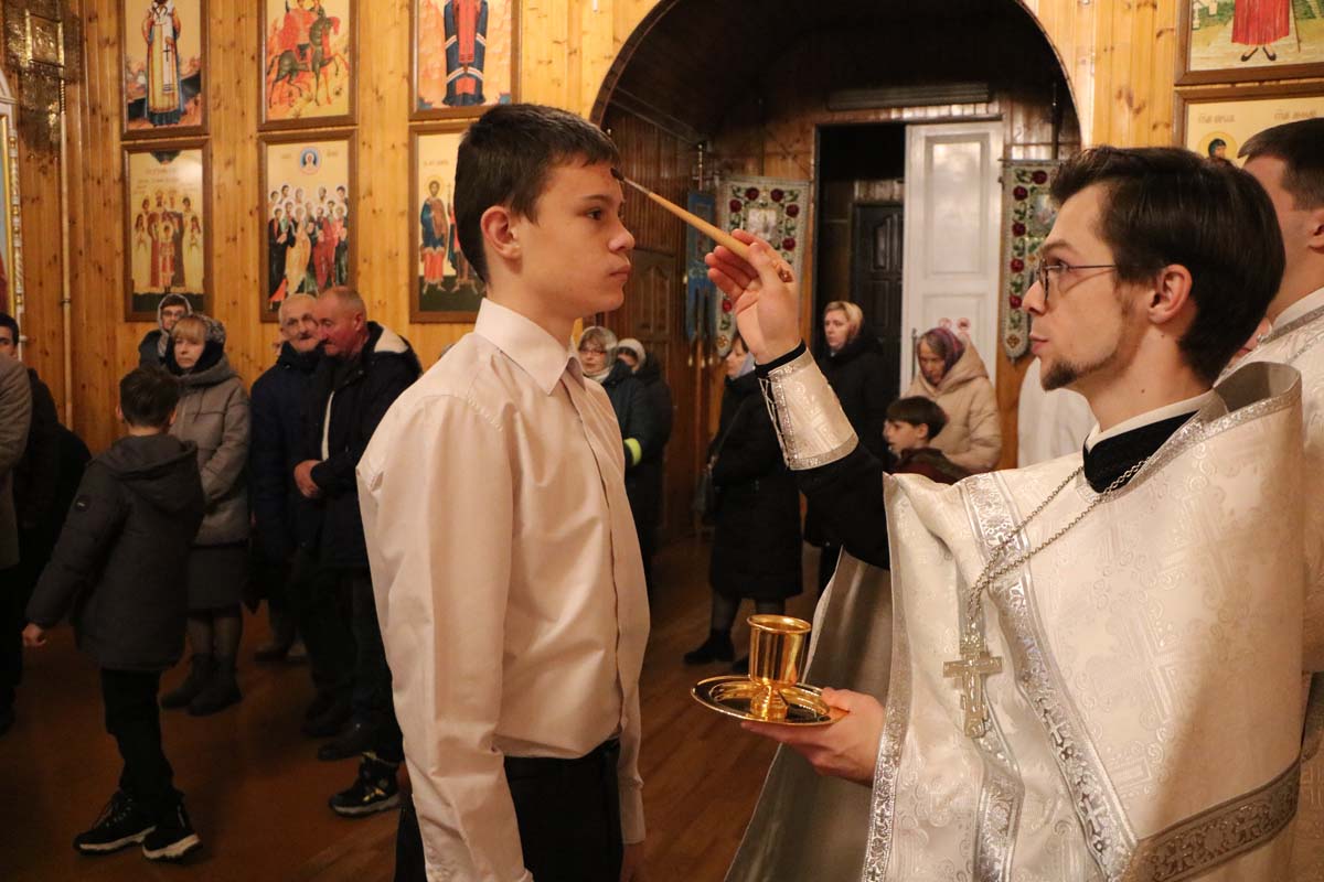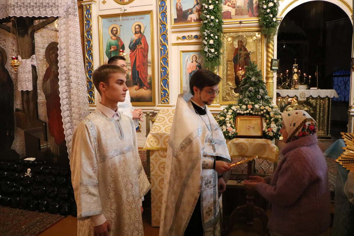 12 января священник Максим Волк совершил Божественную литургию. После чтения Евангелия священнослужитель обратился к молящимся с проповедью об избиении Иродом вифлеемских младенцев (Мф.2,13-23). После сугубой ектении была вознесена молитва о восстановлении мира. Богослужебные песнопения исполнил хор под управлением Петрусевич Е.В. По окончании Божественной литургии был совершен молебен о прощении греха убийства (аборте) «чад во утробе». Указанное молебное пение по традиции прихода совершается в воскресный день после праздника Рождества Христова. Далее была совершена панихида.