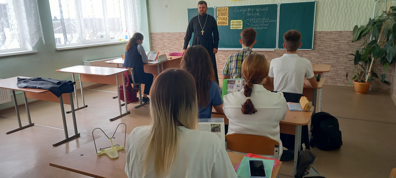 Священнослужитель познакомил учащихся с православным учением о Кресте Господнем, его месте в жизни христианина, суевериях, вытесняющих крестное знамение из жизни общества. Также священнослужитель затронул тему семейных и добрачных отношений, целомудрия в добрачный период и различия любвьи и влюбленности. Отец Пётр отметил, что семья является образом малой Церкви, в основе которой лежит целомудрие. Священнослужитель пожелал ребятам строить отношения на основе целомудрия, не смотря на пример окружающего общества.