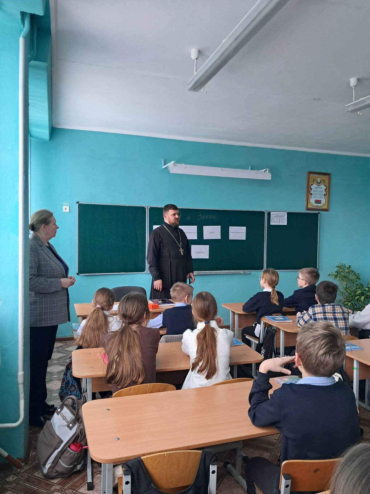 Отец Пётр рассказал школьникам о смысле таких православных праздников, как Рождество Христово и Крещение Господне, а также побеседовал с ребятами о добрых делах и проявлении любви к ближним.